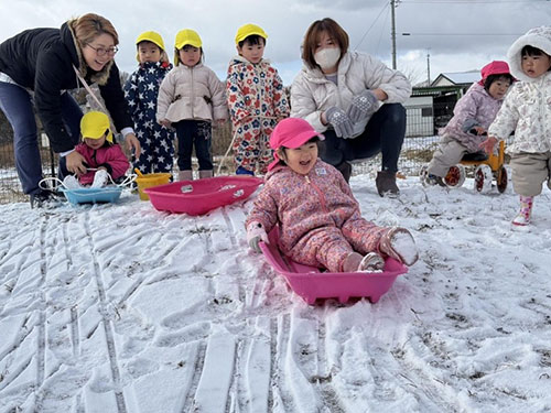 ワクワクしながらスキーウェアを着て、真っ白い園庭に 走って行きます。冬にしか出来ない遊びを楽しんでいます!