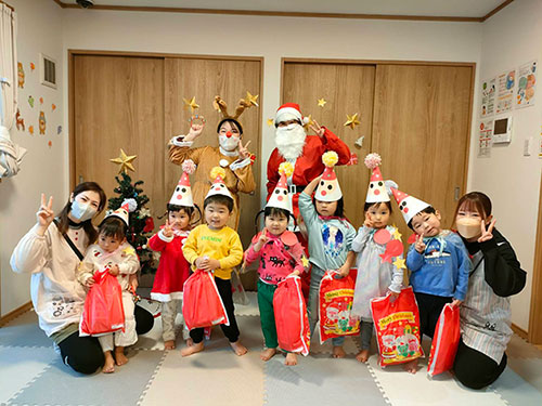 みんなでツリーの飾り付けして心待ちにしていたクリスマス♪ 「メリー クリスマス!」 サンタさんとトナカイさんがやってきた! 『やったぁー!!サンタさん、プレゼントありがとう♡』 夢が叶い、サンタさんに会えて大喜びの子どもたちでした。